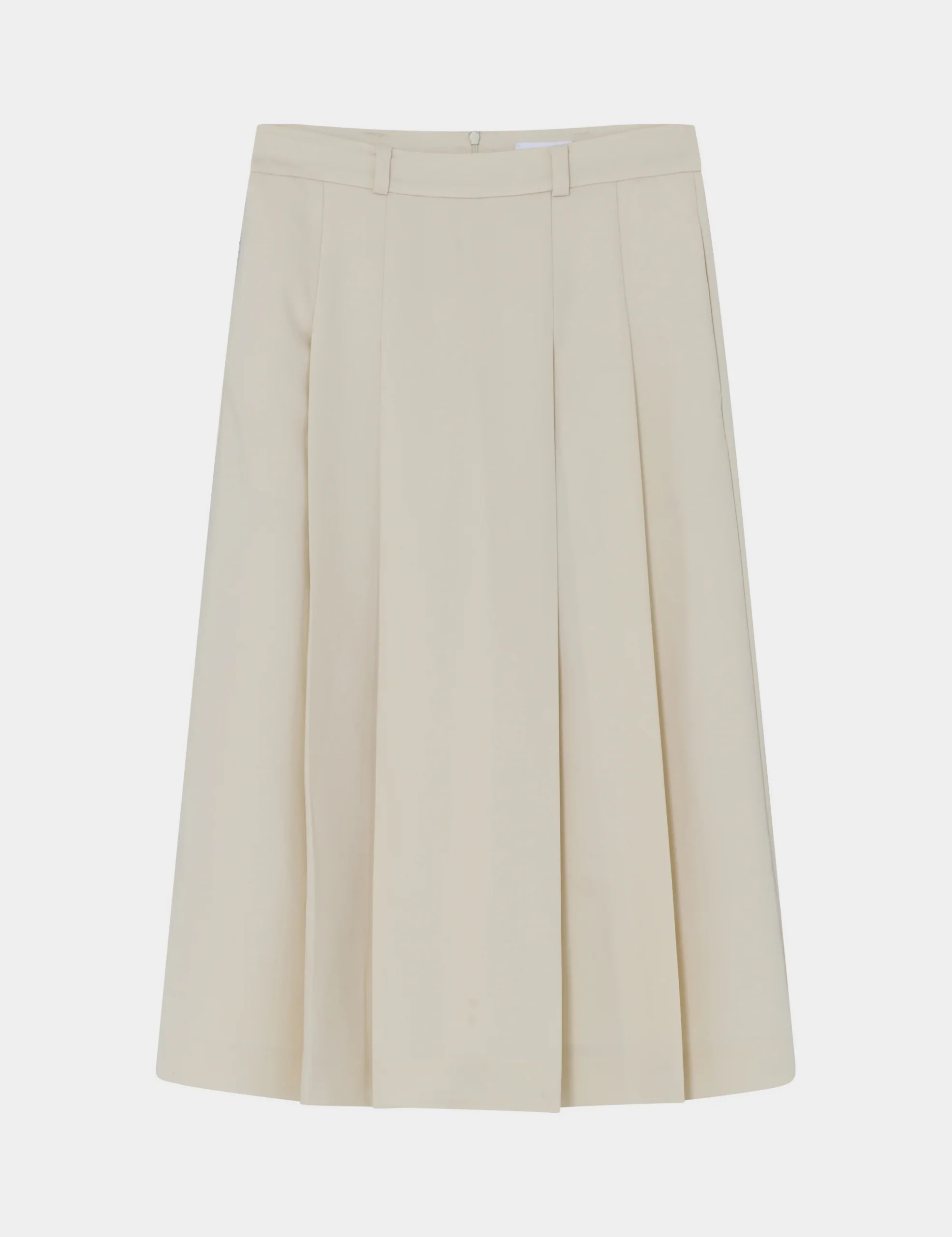 This pleated midi-length A-line skirt features an interior slip, side pockets, and a zip closure in the back.