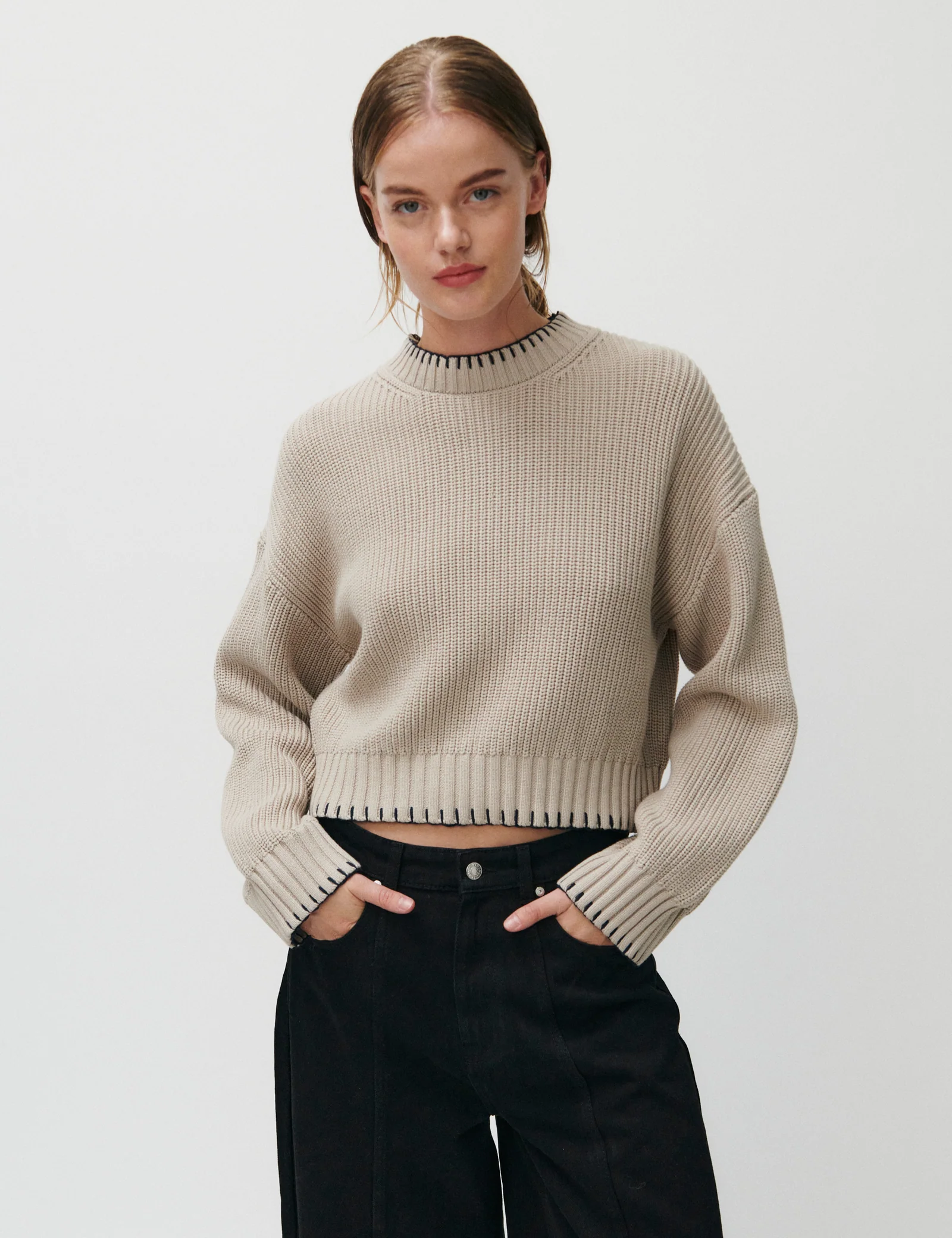 This thick, knitted jumper features a ribbed texture. There is subtle contrast stitching at the neck, wrists, and hem.