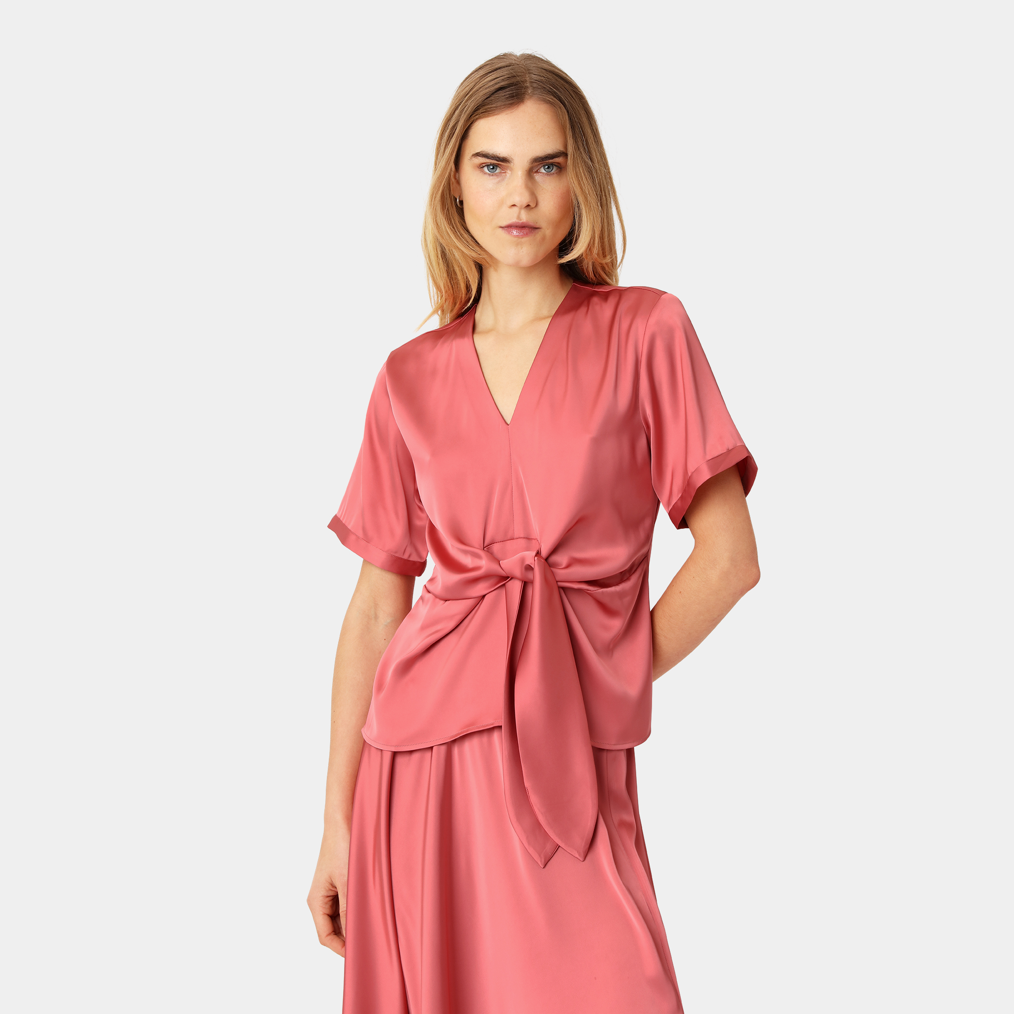 V-neck self-tie blouse in semi rich satin with short sleeves. Also available as a dress.