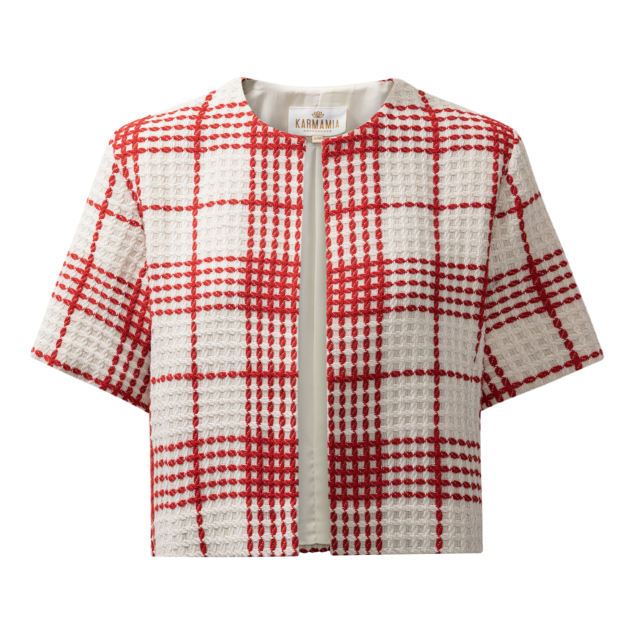 Cropped short sleeved jacket in a wool blend with satin lining.