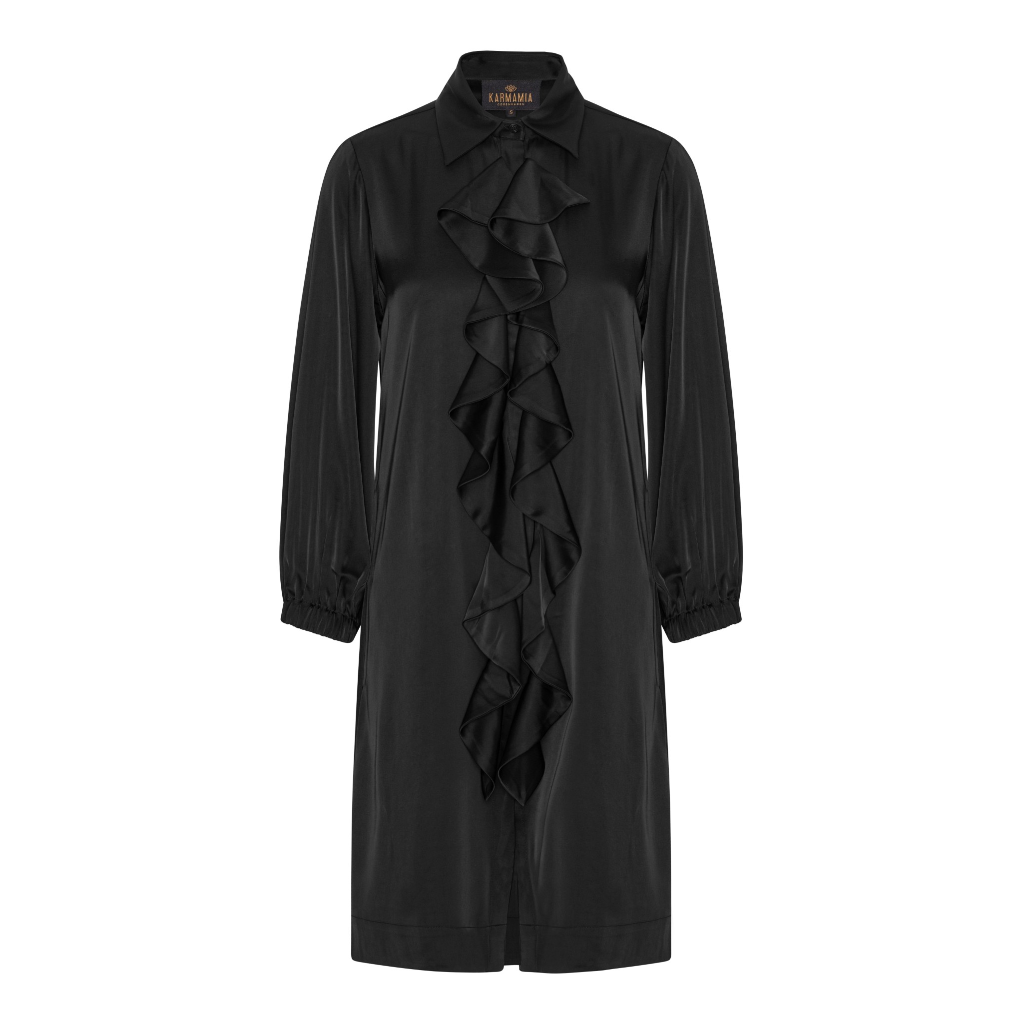 Longline shirt dress with centre frill detail and elastic cuffs for comfort. Can be worn as a dress or open as a cover up.