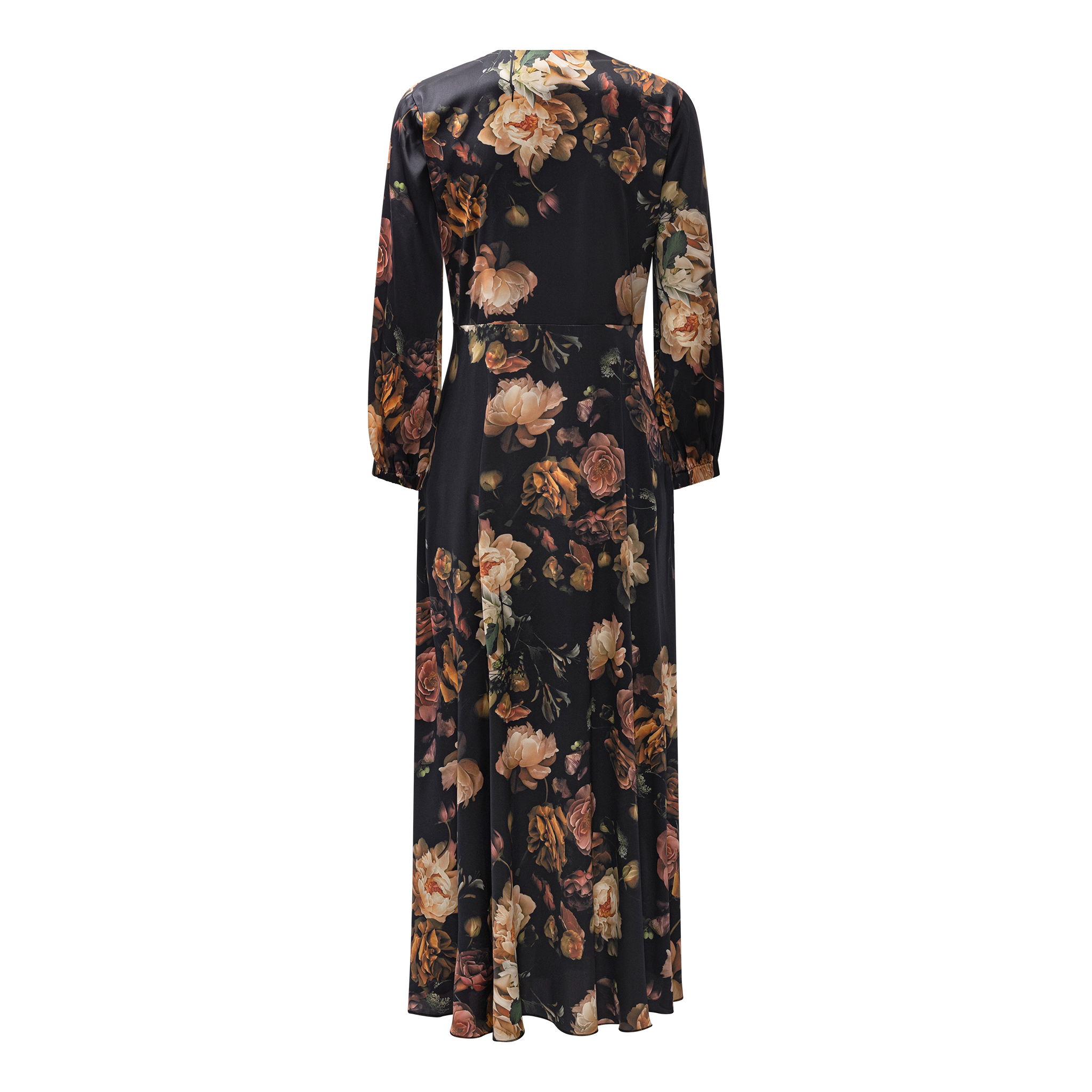 Formal maxi dress with V-neck and tie waist detail. The beautiful dress has short sleeves.
