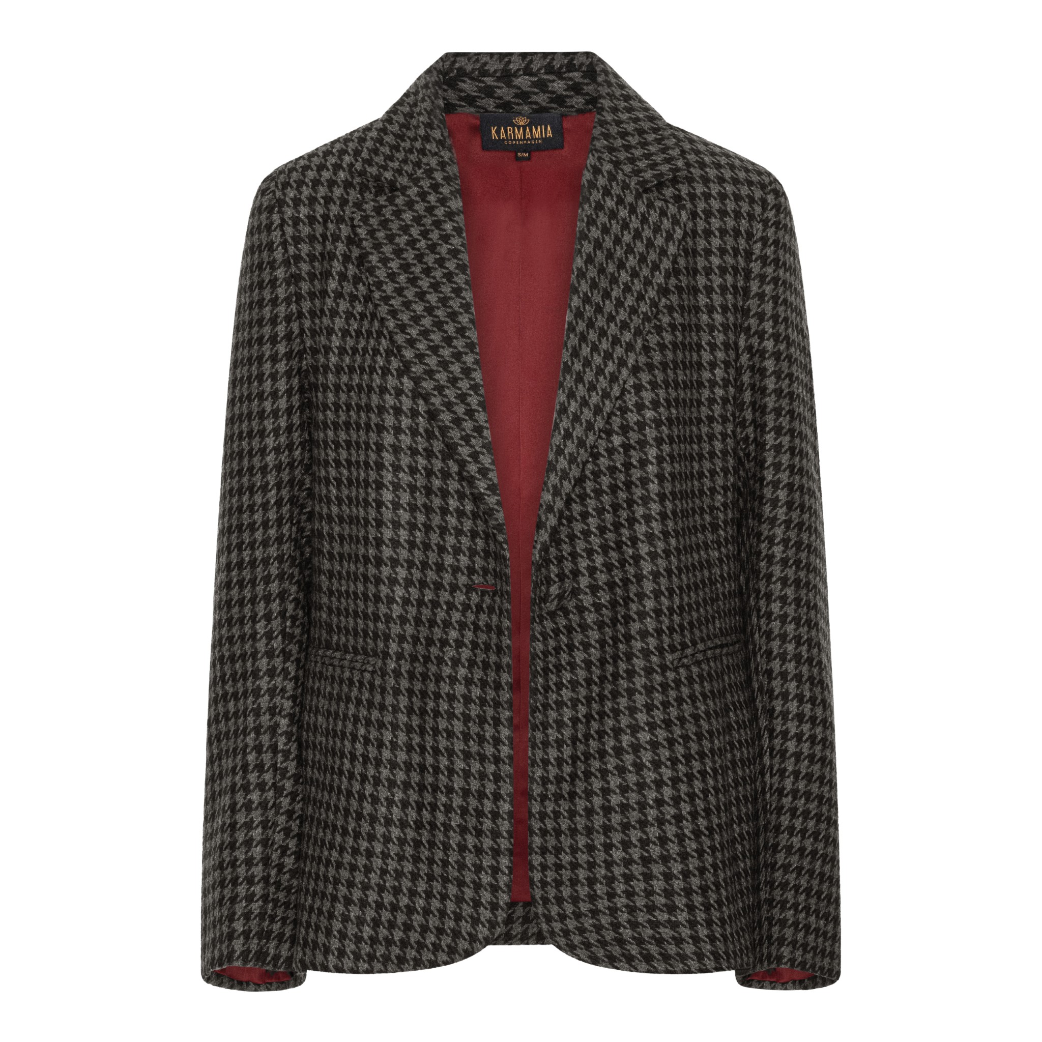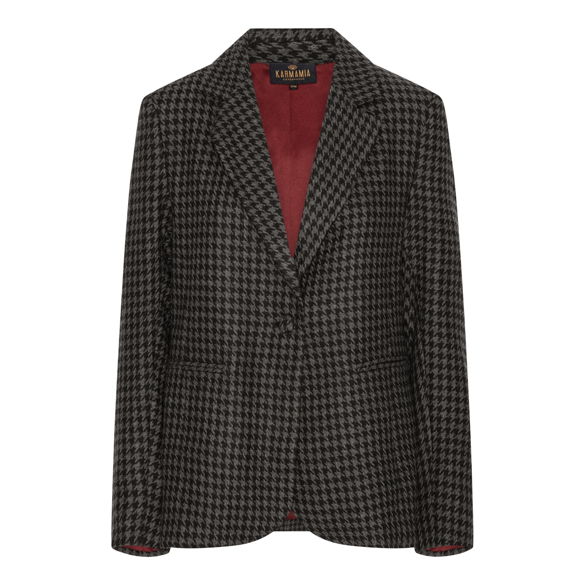 Oversized blazer in traditional tweed fabric. Features single button detailing and pockets.