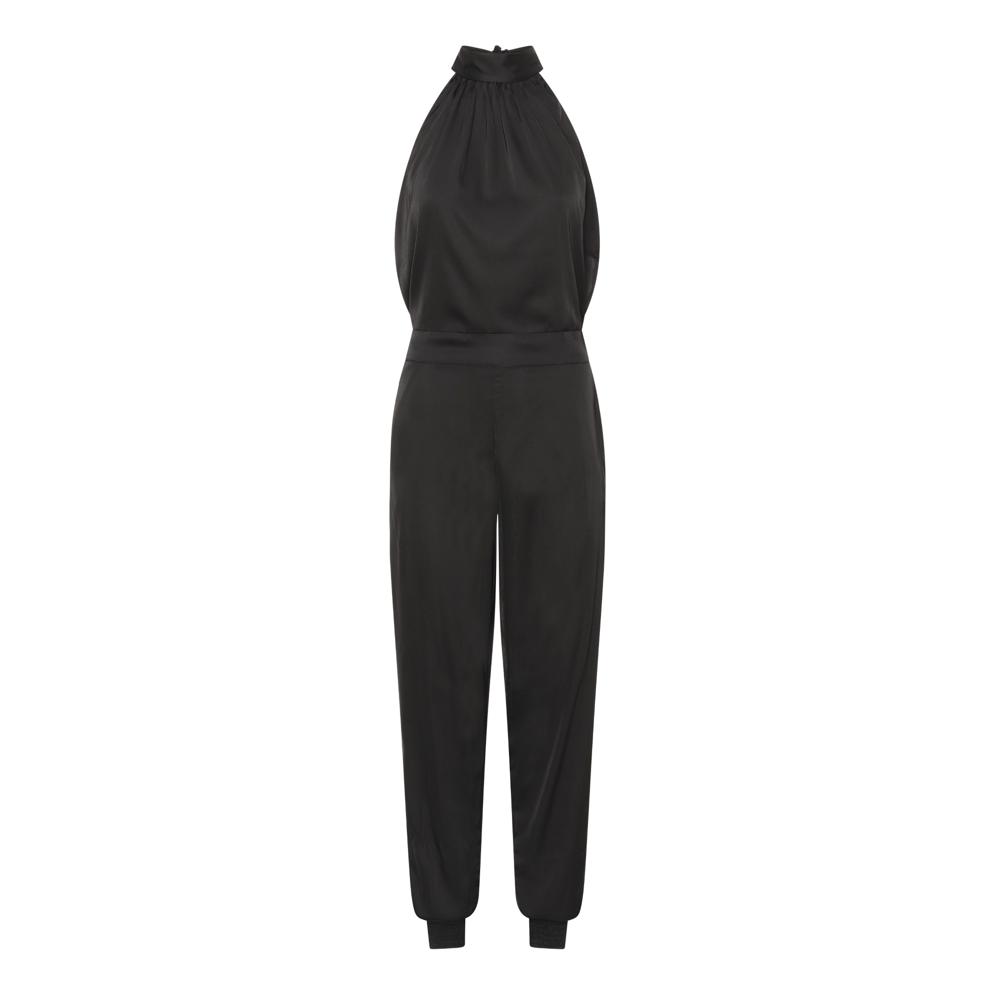 Beautiful, rich and flattering summarize the Lennox Jumpsuit. Made in smooth, silky satin fabric, the jumpsuit features a ribbon closure around the neck to adjust it easily. The sleeveless cut accentuates the arms, and the wide cuff at the ankle keeps the jumpsuit placed firmly above the shoes. For a contemporary shift from the “little black dress”, the Lennox Jumpsuit in black satin is a suitable alternative.